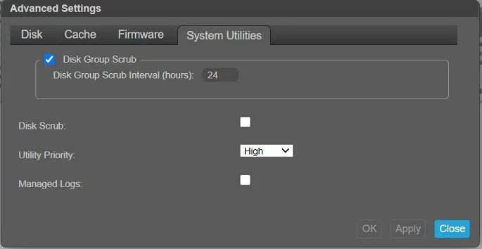 Disk Group Scrub是系统持续分析磁盘组中的磁盘以查找和修复磁盘错误,类似阵列卡中巡读功能。Disk Group Scrub进程时间间隔设置过短,容易因频繁读写磁盘导致磁盘过早损坏,因此新版本固件已经将默认时间间隔提升至360小时。若不能进行固件升级,可以单独修改此选项。