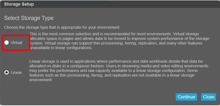 ➋ 系统会提示您选择要为您的环境启用的存储类型,选择virtual 或 linear;如果选择 virtual,将启用虚拟资源调配选项和功能;如果选择 linear,将启用线性资源调配选项和功能。